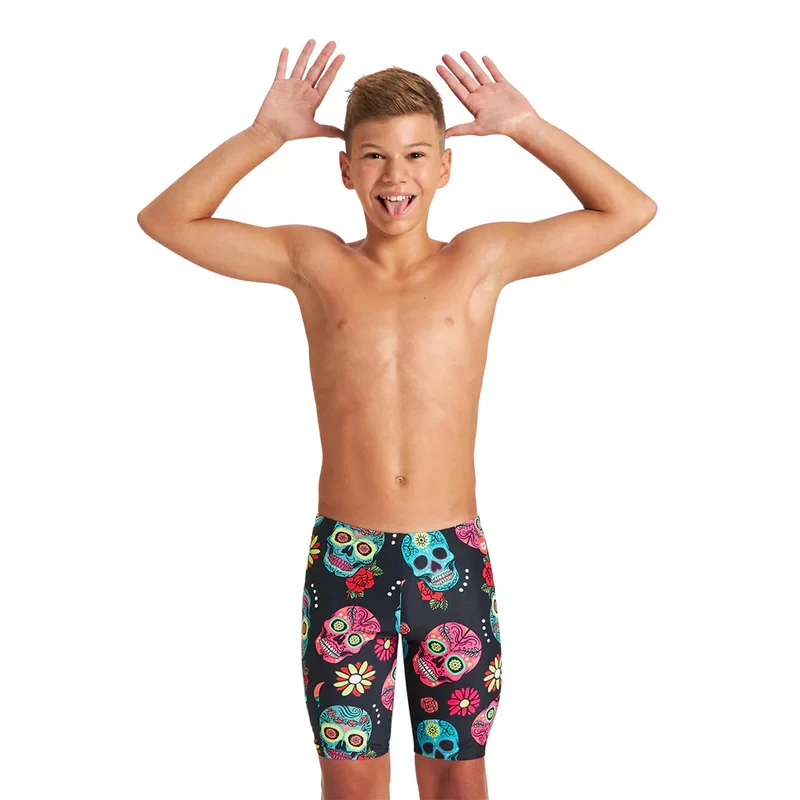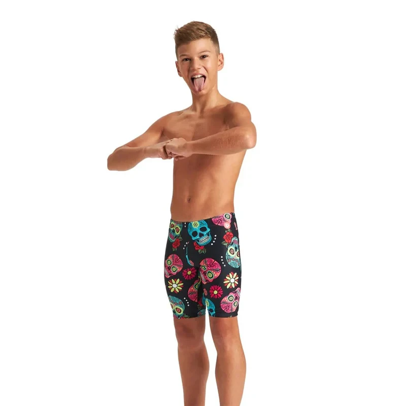 nspired by Mexican traditions, our Crazy Skulls Carnival Jammers are printed with neon calaveras and flowers that really pop against the black background. Designed for the long haul of competitive training and intensive swim sessions, team them with an arena swim cap and goggles.