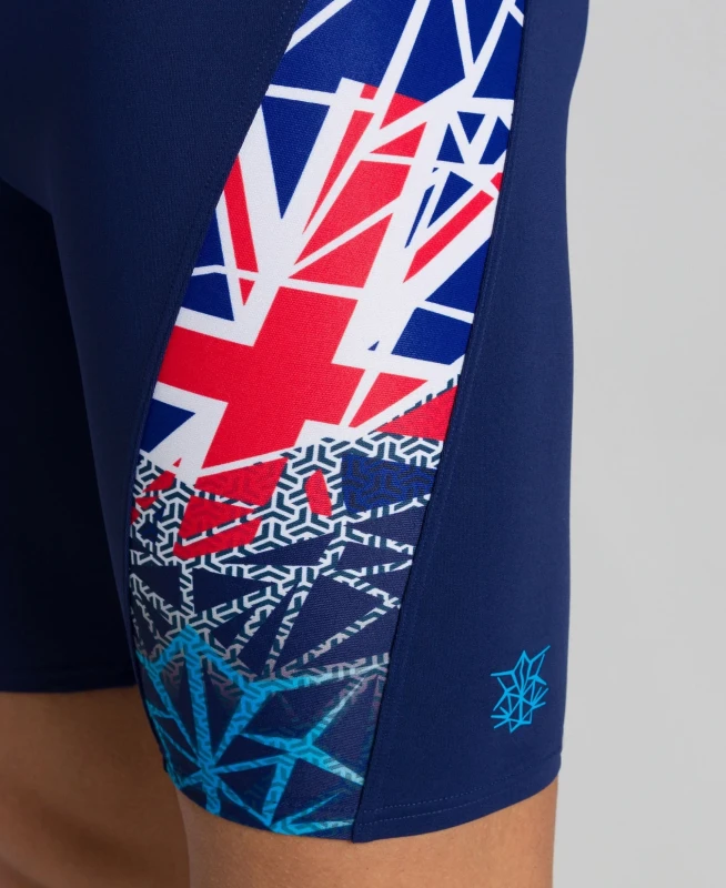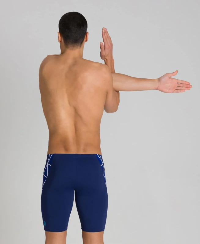 Train for your next race in a men's swimsuit that channels your fighting spirit. This sleek style is patterned with a geometric print combining the face and armour of Bishamon, the Far East divinity of warriors and victory. Made for intensive swimming, match our Bishamon Jammers UK with the collection's cap. MaxLife is an arena exclusive swimwear fabric with maximum resistance to chlorinated water. This textile combines excellent fit with shape retention power and hydrodynamic performance. Plus it’s quick to dry and has built-in 50+ UV protection. Our jammers are engineered for drag-free swimming. This suit measures 45 cm long, streamlining you from mid-waist to just above the knee. Finished with an internal drawstring.